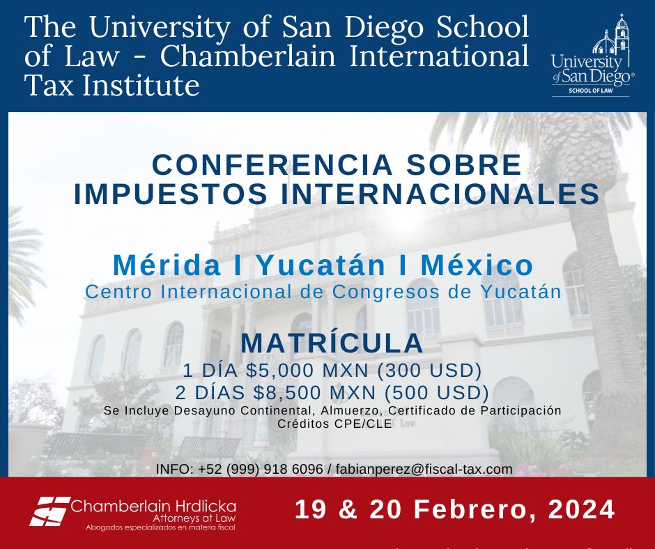 La Conferencia Sobre Impuestos Internacionales Univeresity of San Diego School of Law – Chamberlain International Tax Institute 2024 se acerca rápidamente! El evento tendrá lugar los días 19 y 20 de febrero de 2024 en el Centro Internacional de Congresos en Mérida, México: